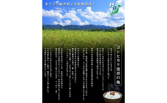 コシヒカリの誕生の地福井県よりお届け福井県産コシヒカリは緑豊かな山川と湿潤な気候により稲作栽培に適した自然環境で育っています。